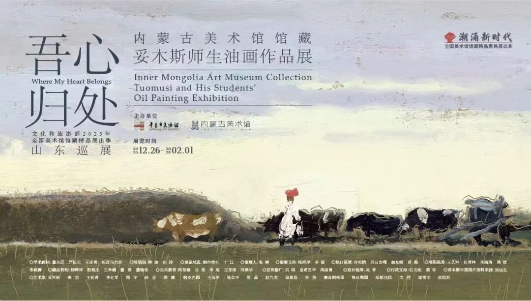 “吾心归处——内蒙古美术馆馆藏妥木斯师生油画作品展”精选内蒙古美术馆馆藏作品40幅,并特邀49幅妥木斯及其19位学生的代表性油画作品,以及部分创作手稿、资料等,其中25幅作品为入藏后首次展出。此展以“吾土吾念——妥木斯的艺术人生”“薪火相传——师生对话场域”“当代回声——草原意象的归心之旅”三个篇章展开,既是对妥木斯先生艺术生涯的梳理与致敬,亦是对其艺术精神传承的呈现与探讨,旨在透过作品勾勒妥木斯先生及其学生们的艺术探索轨迹,进而探究内蒙古题材在当代油画创作中的生命力与可能性。