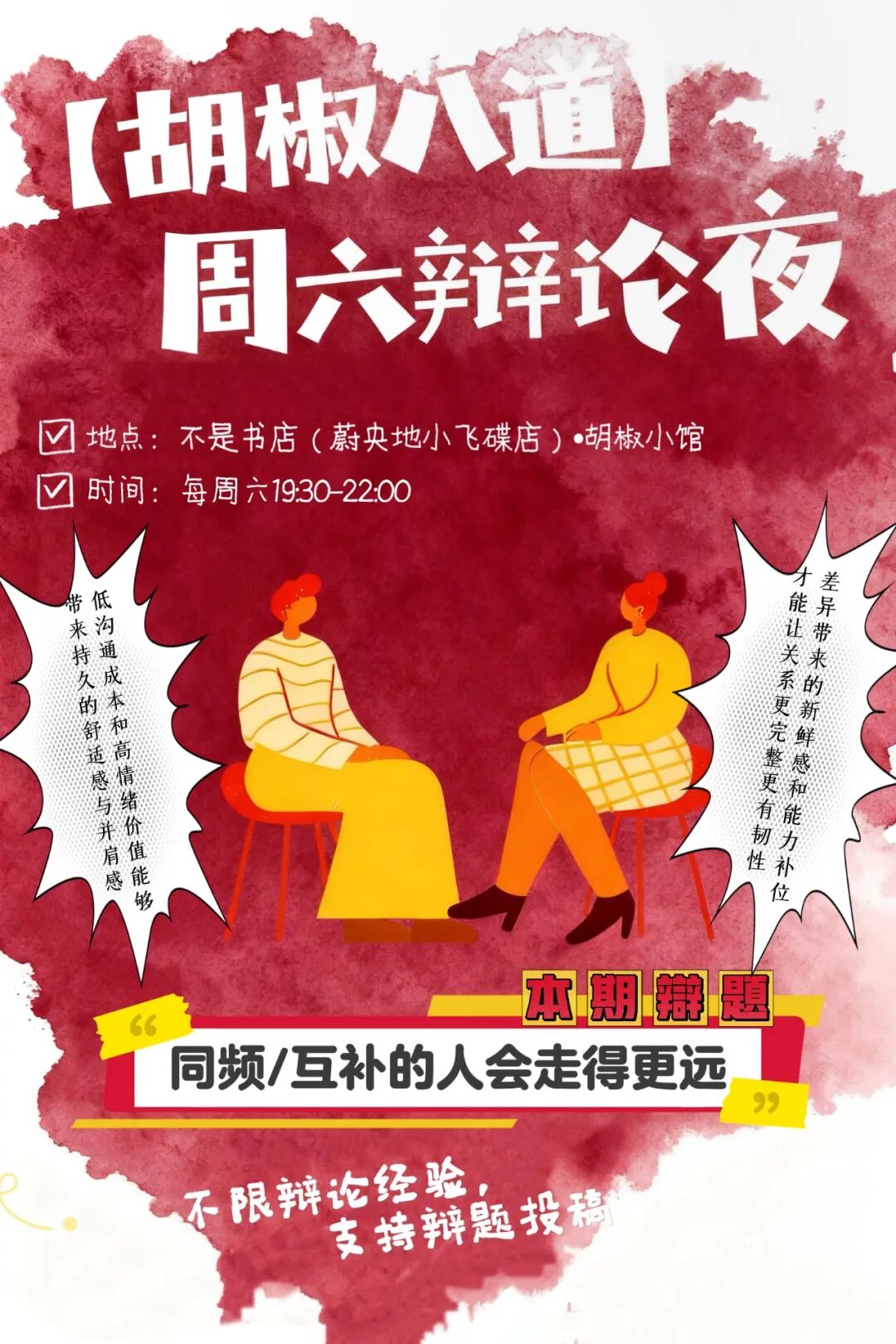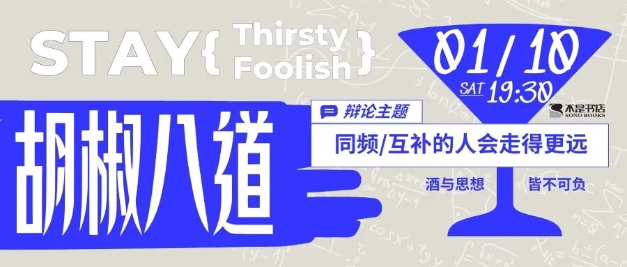每个周六晚上【不是书店·胡椒小馆】将化身“学术酒吧”,举办“胡椒八道辩论”,邀你用逻辑为矛,以观点为盾,在微醺的氛围里,与同频的灵魂展开一场酣畅淋漓的辩论!