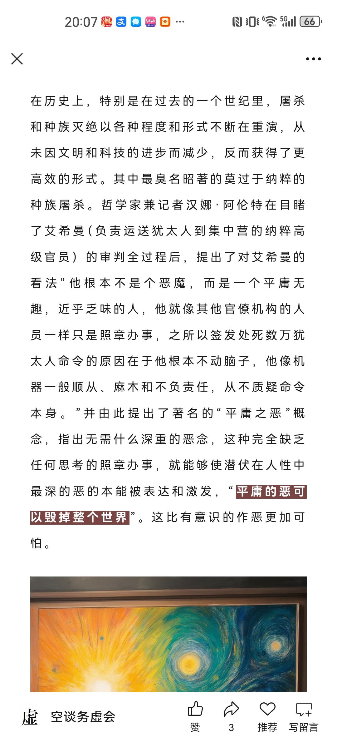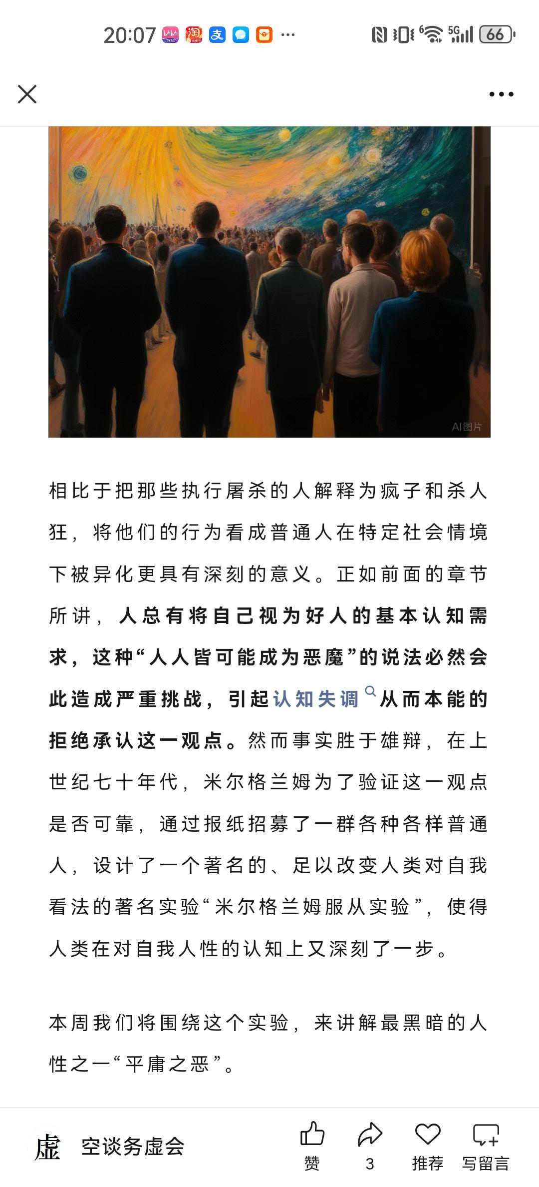 无论是屠杀犹太人的纳粹,还是南京大屠杀里的日本兵,亦或是卢旺达屠杀里的胡图族人,绝大部分的参与者并非天生的杀人狂,反而是与我们一样的普通人,他们在特定的情境下被环境裹挟,丧失了基本的思考能力从而犯下了“平庸之恶”。这是给所有人敲响的丧钟和警钟,值得每个人去深思和警醒。