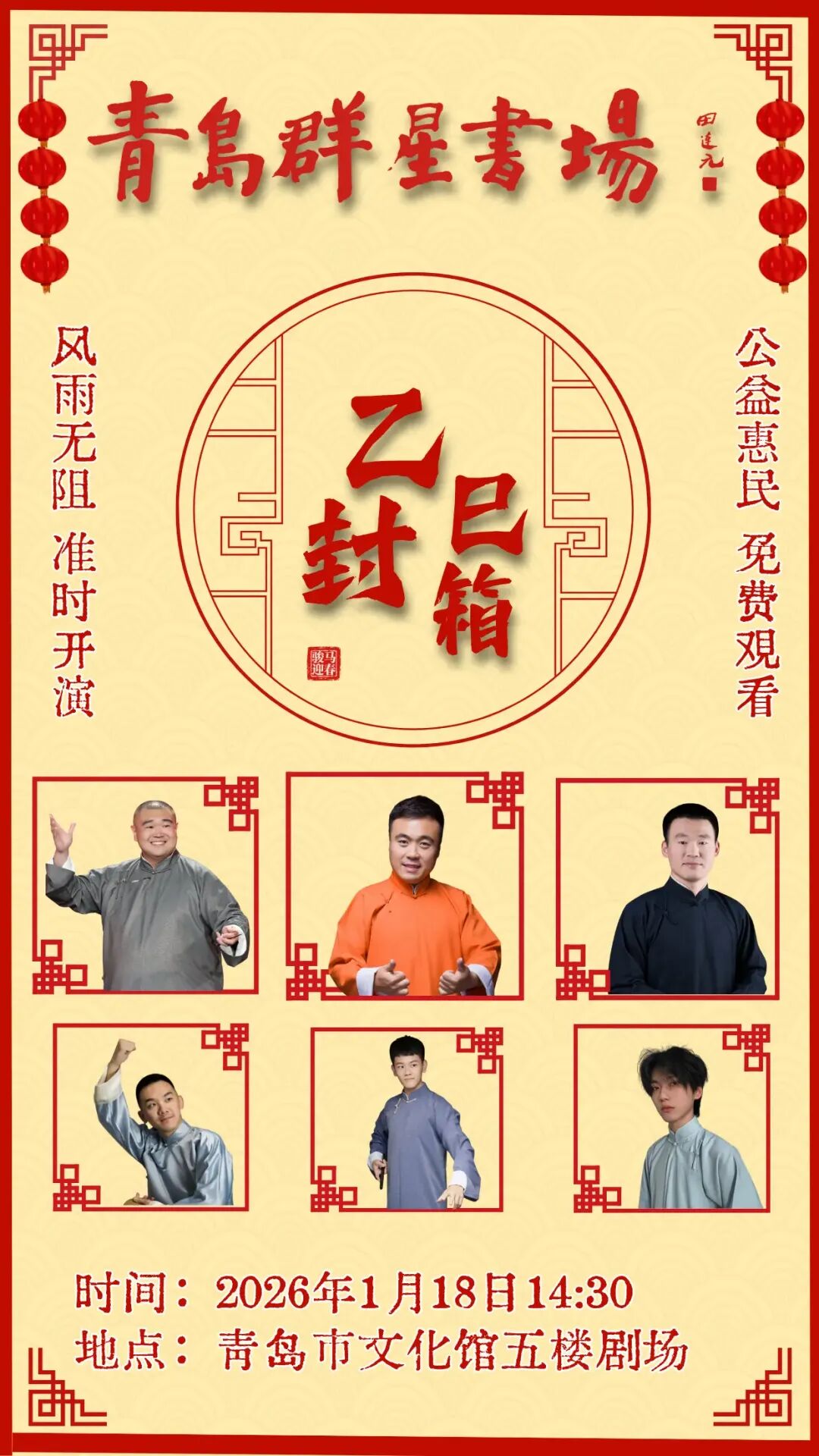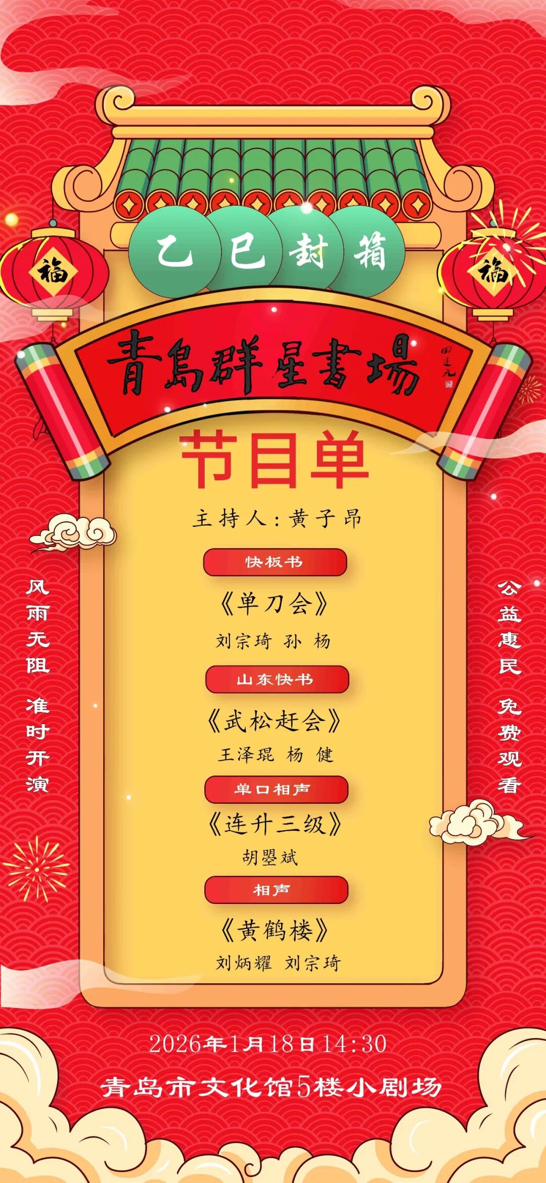 诚邀热爱曲艺的您,携亲朋、带笑意,与我们共度一段欢乐时光。青岛群星书场,与您不见不散!