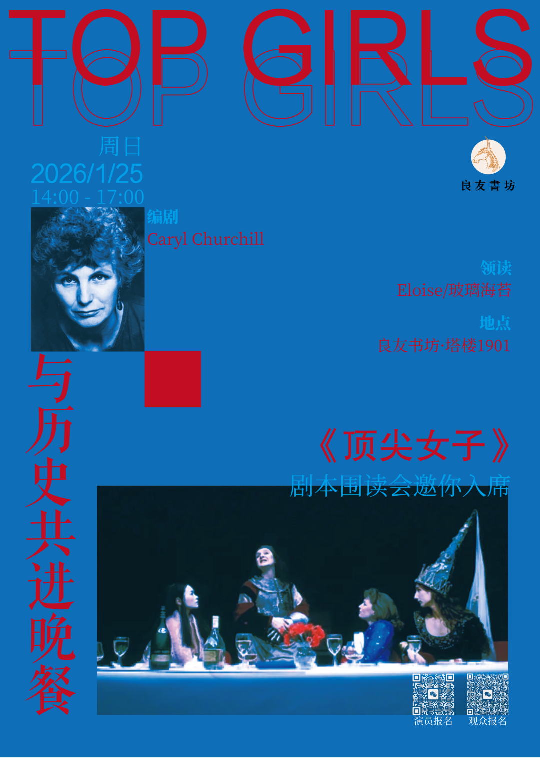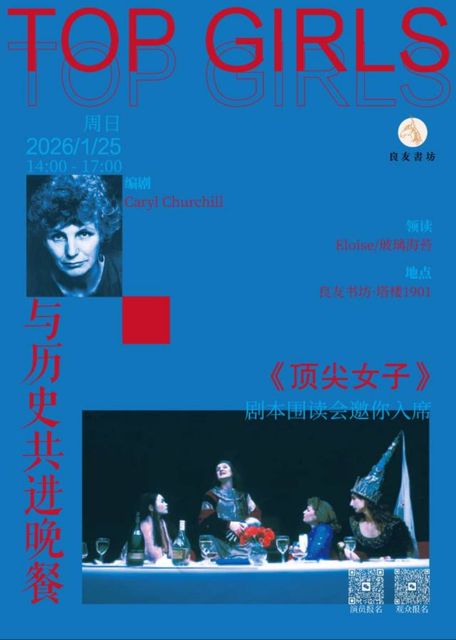 1月25日下午2点,戏剧人Eloise做客良友书坊·塔楼1901,带来一场别开生面的《顶尖女子》剧本围读会。让我们用声音激活文字,重新审视那些挣扎、野心、抉择与回响。欢迎加入这场穿越时空的对话,与历史共进晚餐。