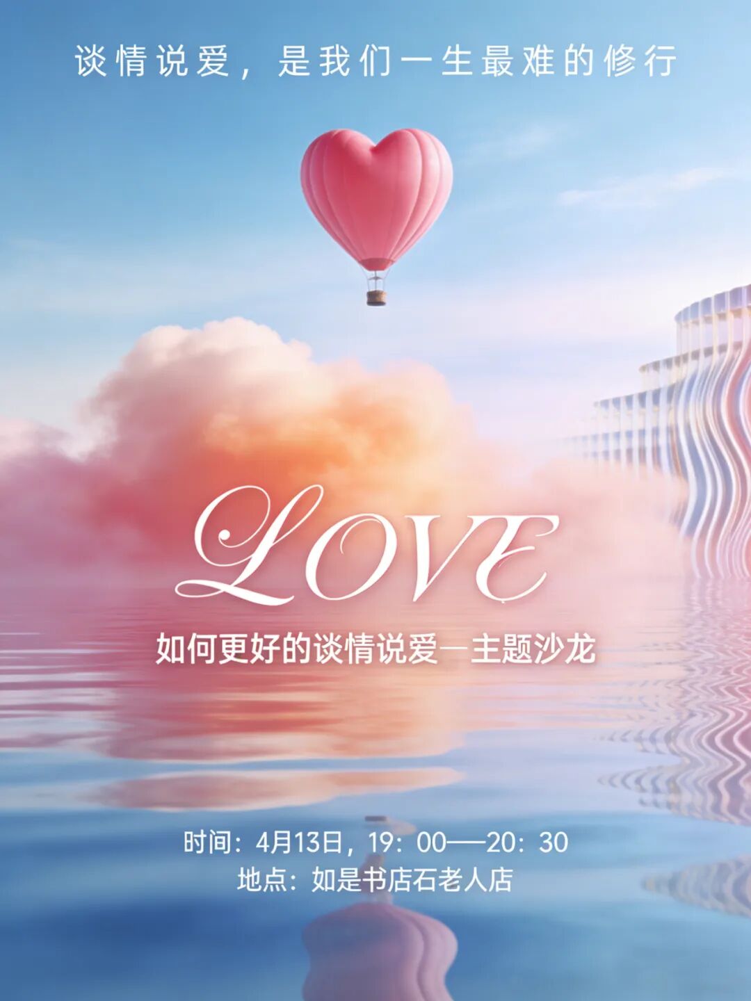 4月13日(周一)晚19:00-20:30,将在如是书店石老人店举办的一场特别沙龙——《如何更好的谈情说爱》