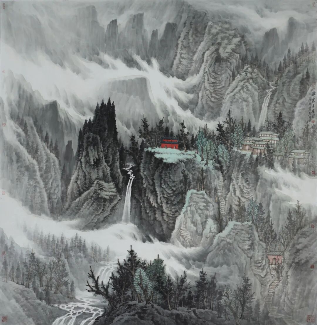 曾先国《烟云古寺图》180×180cm