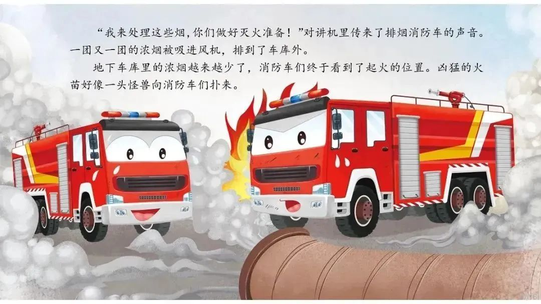 直到有一天,地下车库着火了,浓烟滚滚,这时,排烟消防车来了……让我们跟随飞飞老师,听一听排烟消防车是怎么处理火情的。