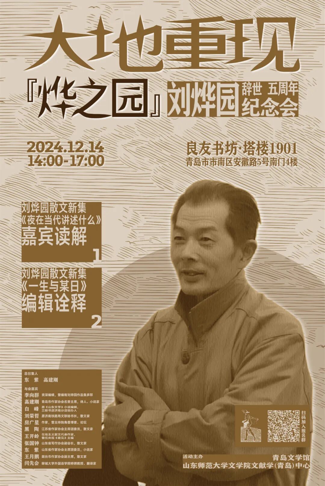 12月14日(周六)下午2:00,“大地重现‘烨之园’——刘烨园辞世五周年纪念会”将在良友书坊·塔楼1901举办。本次活动由青岛文学馆、山东师范大学文学院文献学(青岛)中心主办,东紫、高建刚担纲总召集人,与会嘉宾均与刘烨园有深入的精神交集。“精神的来去总是那么孤独。然而,人的力量也就在这里。”追念,也是一种重逢。祝我们都能在自己的命运里完成自己。