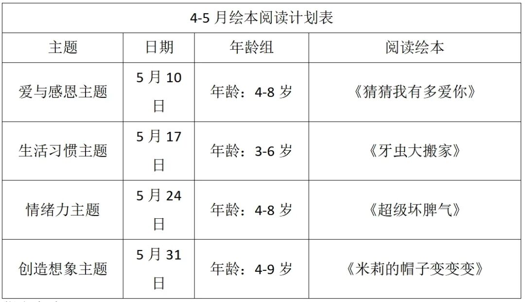2.根据下方绘本阅读计划表,持续关注“崂山区图书馆”微信公众号每周六推出的绘本故事。