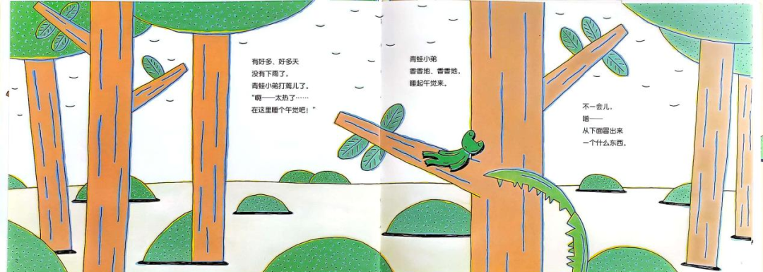 《青蛙小弟睡午觉》是由著名日本绘本作家宫西达也创作,讲述了一个炎热夏日,青蛙小弟在树上香香地睡午觉的故事。然而,他的午睡并不平静,天敌一个接一个地出现,每个都张着大嘴想要吃他。