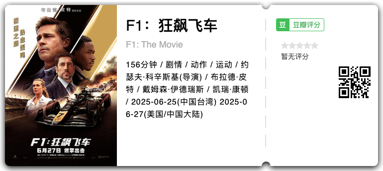 本周五,「八又迷影组」将带来《F1:狂飙飞车》专场放映活动。参与本场观影的每位观众都会获得本片的正版工艺海报一份,款式任选。在映后抽奖环节,中奖者可以补齐全套4张海报(根据报名人数确定抽奖数量)。