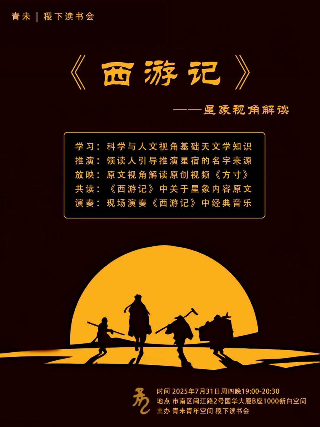 继青未稷下读书会带领大家共读“星象视角的《诗经》”之后,本周我们将在青岛组织大家继续探索星象视角系列之《西游记》,欢迎朋友们来一起推演星名、了解夜晚星星的天象特点及衍生出来的神话人物特点,并打开一个阅读《西游记》的全新视角。