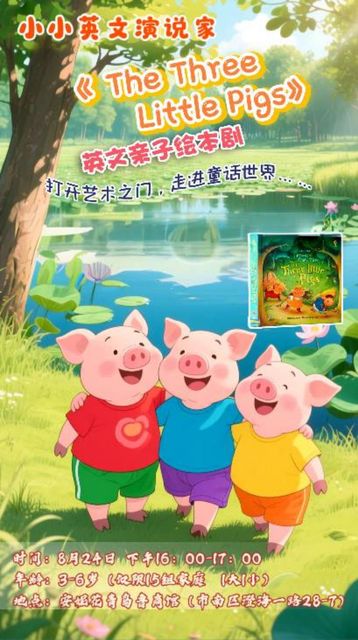 本场活动将一起共读《The Three Little Pigs》英文亲子绘本故事。利用丰富的道具,通过趣味讲解和场景演绎的形式,展示绘本中描绘的场景,从而让孩子快速理解绘本故事内容,让孩子养成阅读习惯,爱上阅读。