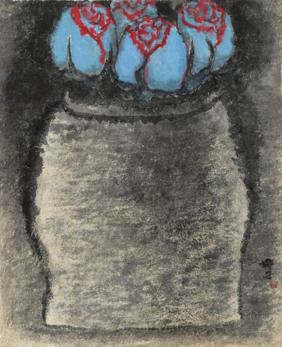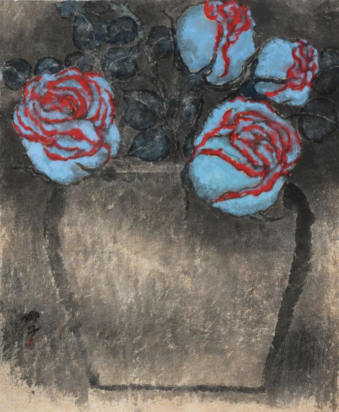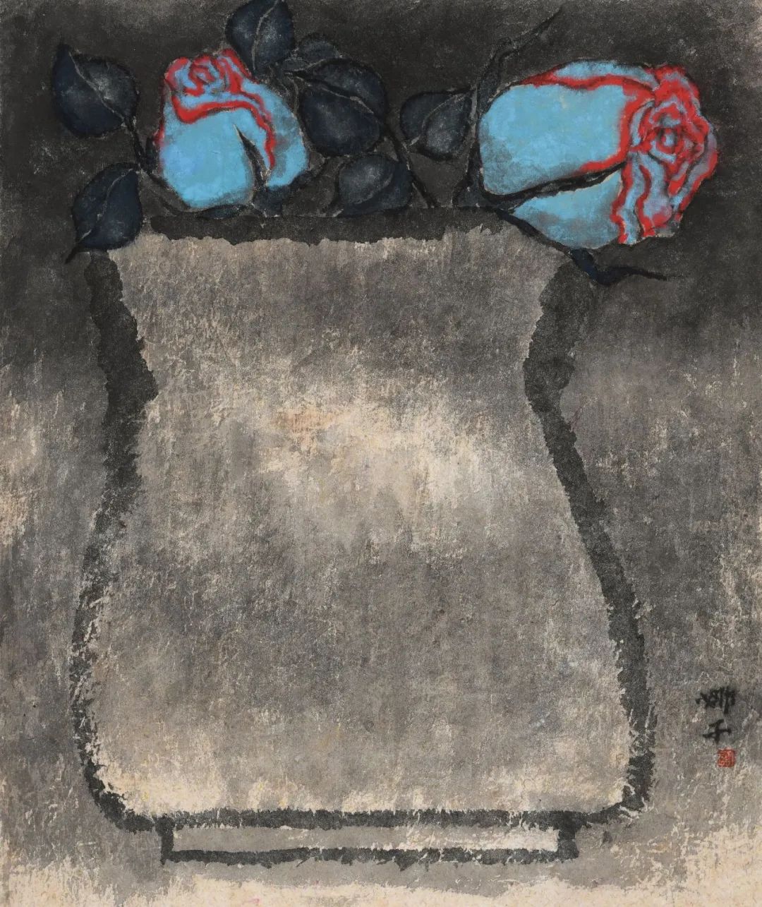 何唯娜总说自己“是被传统喂大的”。她毕业于四川美术学院中国画系。《器》系列是她近年最受关注的创作,这次她也带来了这组作品。《器》系列里没有宏大的形,就画些瓶、罐、花,却藏着她对“女性”的琢磨。其作品氤氲着形神交错的迷离气质,在梦幻表象下暗涌着个体与时代碰撞的精神苦涩,将存在的困顿转化为富有哲思的艺术语言。她的作品里有的器皿口是歪的,像没放稳的船;有的内壁晕着淡墨,像积了层雾。“都说‘器’是用来装东西的。”她笑着说,“女人不也是吗?装着生活,装着情绪,装着自己。” 所以说,《器》系列是女性精神物化的诗篇,是对传统容器意象的解构,更是当代女性内在力量的显现。