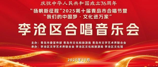 秋意正浓,歌声飞扬。“扬帆新征程”2025第十届青岛市合唱节暨“我们的中国梦·文化进万家”李沧区合唱音乐会将于10月16日隆重举行!一场汇聚岛城合唱艺术精华的音乐盛宴即将拉开帷幕,诚邀广大市民朋友共赴这场视听之约。