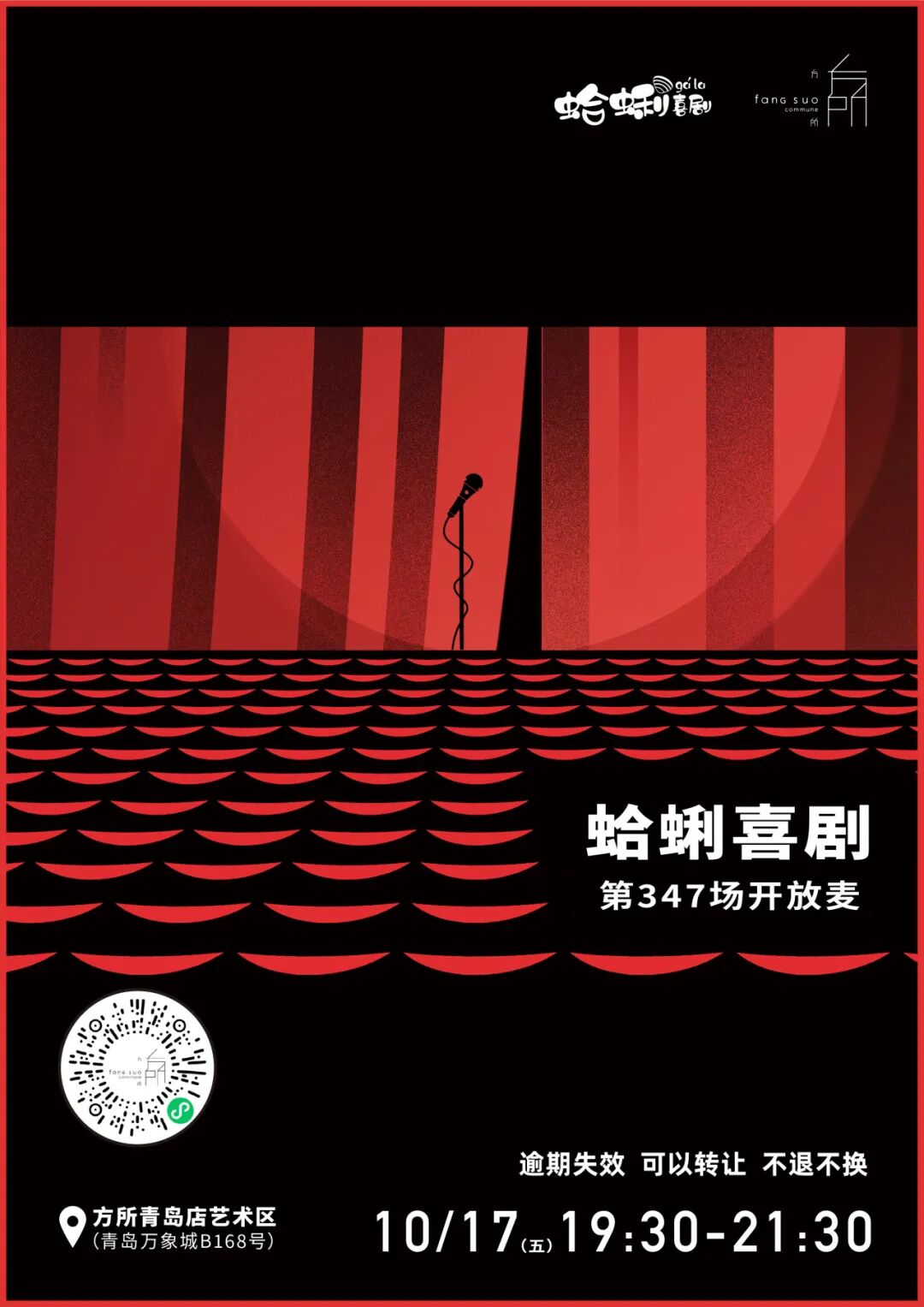 本周五(10月17日)晚七点半,蛤蜊喜剧开放麦将在方所青岛店准时开演。欢迎感兴趣的朋友报名参与!