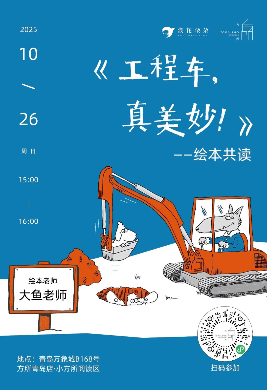 10月26日(周日)15:00,大鱼老师带小朋友们一起读《工程车,真美妙!》,在愉快的阅读中,轻松爱上这些功能强大的钢铁伙伴,开启对机械世界的好奇心与热爱!