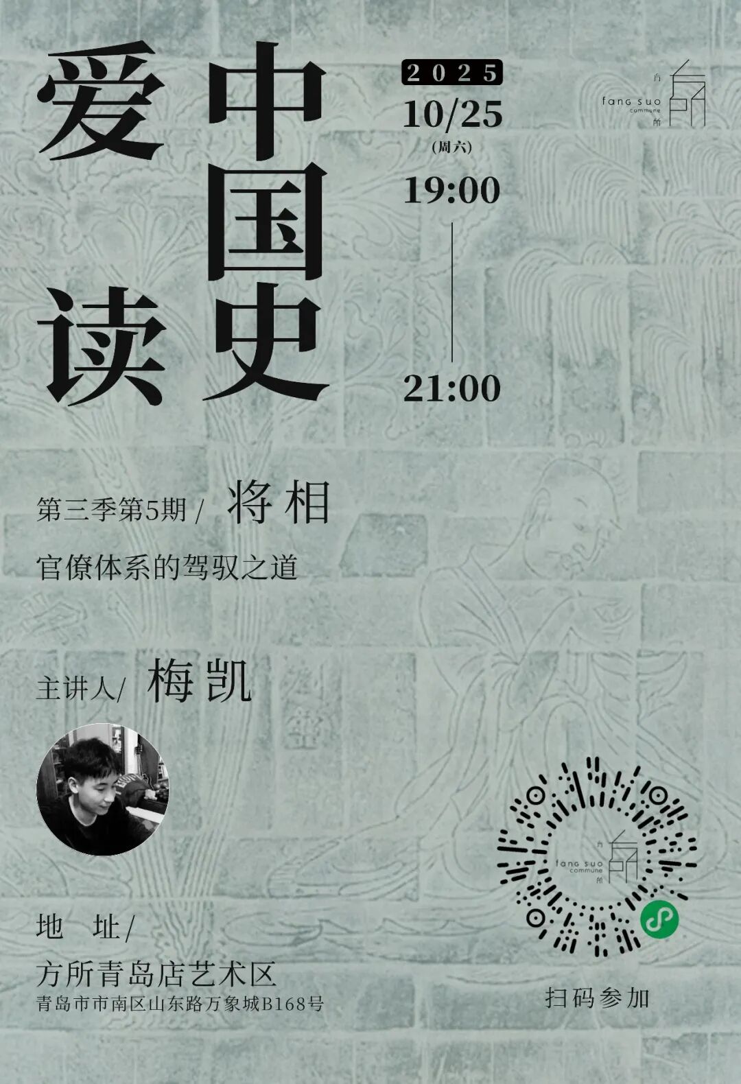 「爱读中国史」是梅老师继爱读世界史分享会、全球通史共读会、汉学共读会之后,在青岛方所开展的新分享系列。这个系列内容庞大,分六季,以每季五期进行(第一季、第二季已完结)。