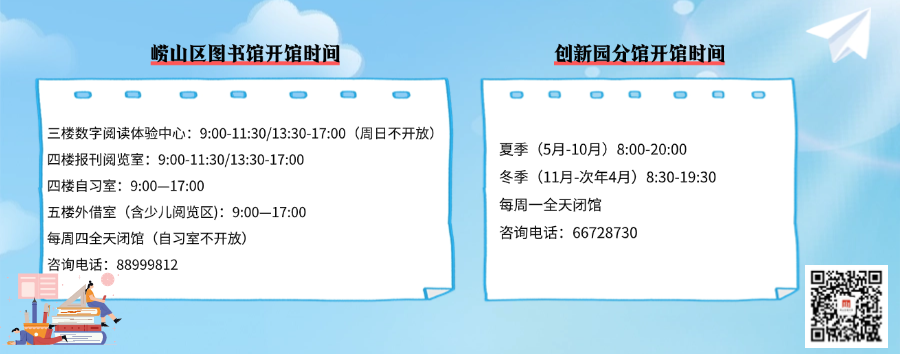3. 参与活动即表示您授权崂山区图书馆无偿使用您在活动中的照片和视频,本次授权不涉及任何商业目的,仅用作公益宣传和阅读推广活动。