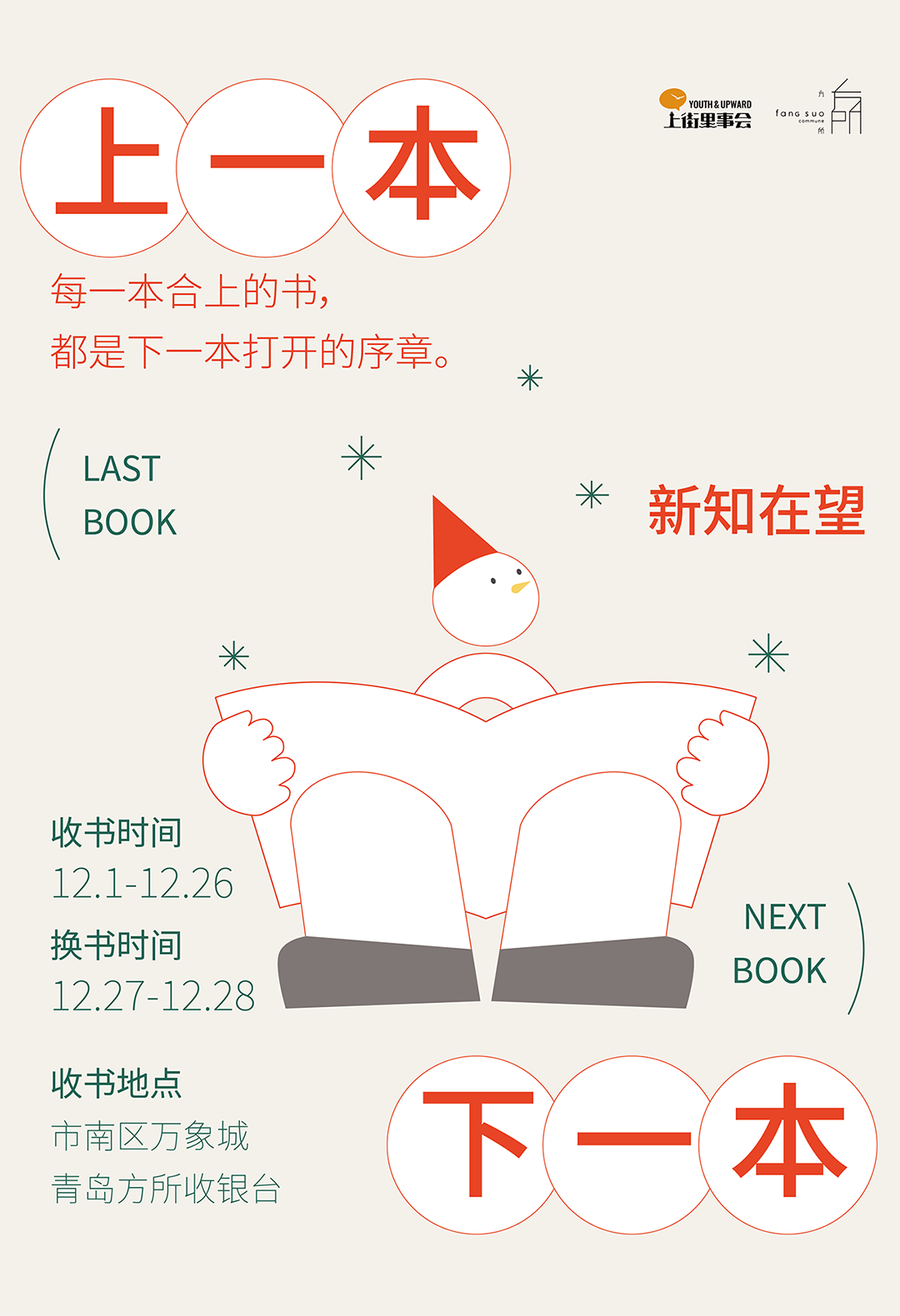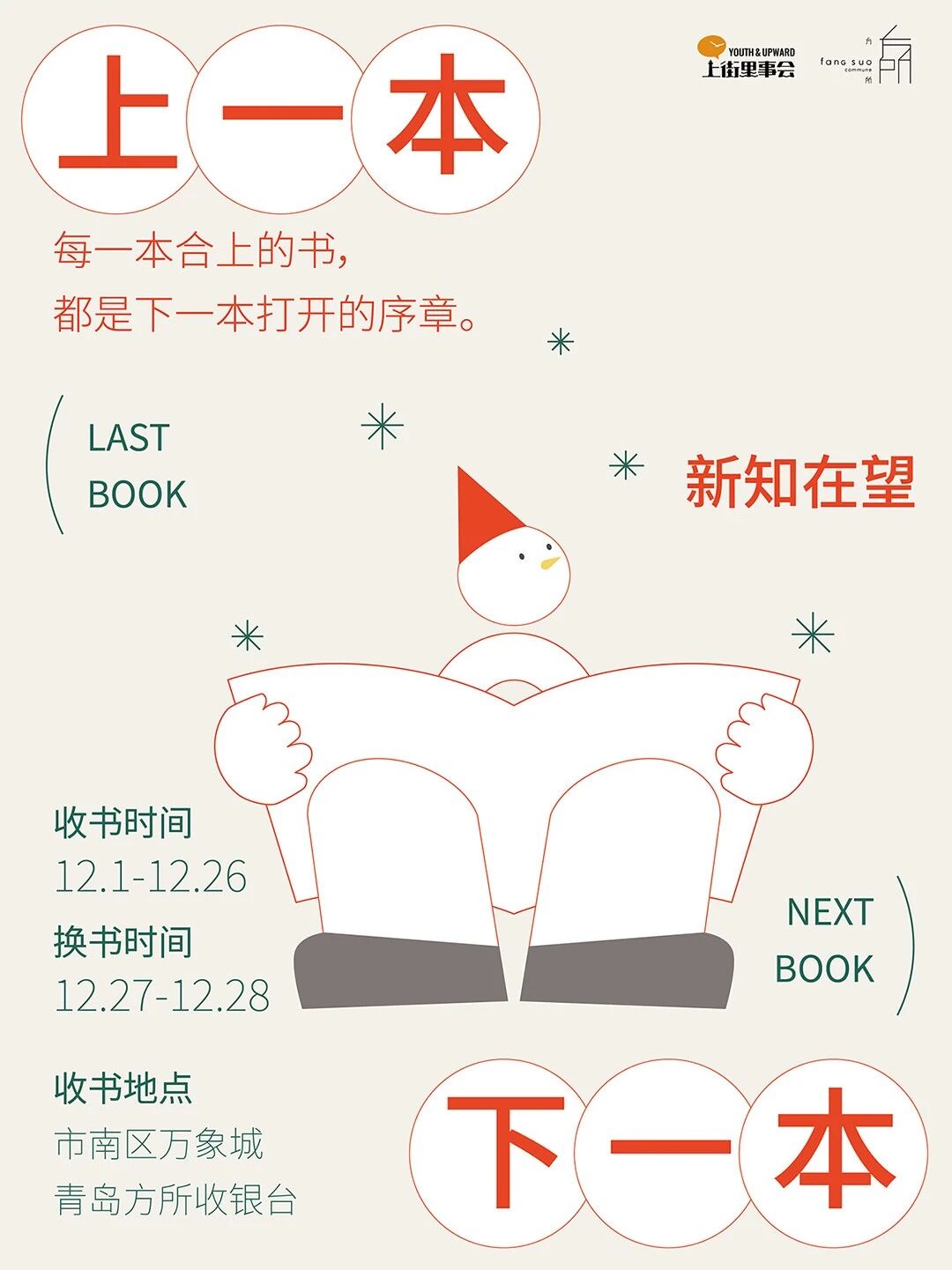 这是上街里事会联合青岛方所发起的书籍环保企划【上一本,下一本——新知在望】旧书换旧书盲盒,你的上一本会变成谁的下一本,12月1日起开启旧书提交,2026即将来临之际让我们一起告别旧章,邂逅新知。