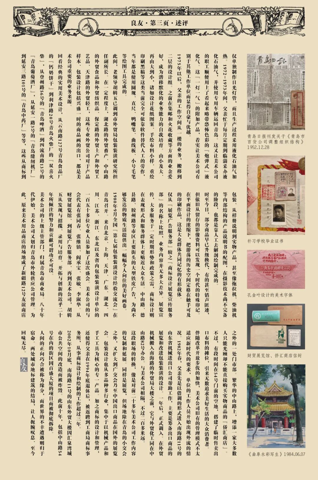 12月7日下午3时,“趣守——设计师的百宝箱·张敏文献展”将在良友书坊·中心店启幕。本场展览由良友书坊与青岛市美术馆联合出品,是青岛美术公司研究系列展的第四场个展,亦是一场关于设计、商贸与城市记忆的对话。