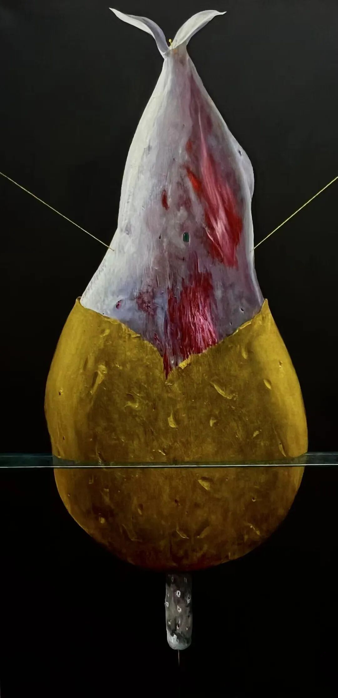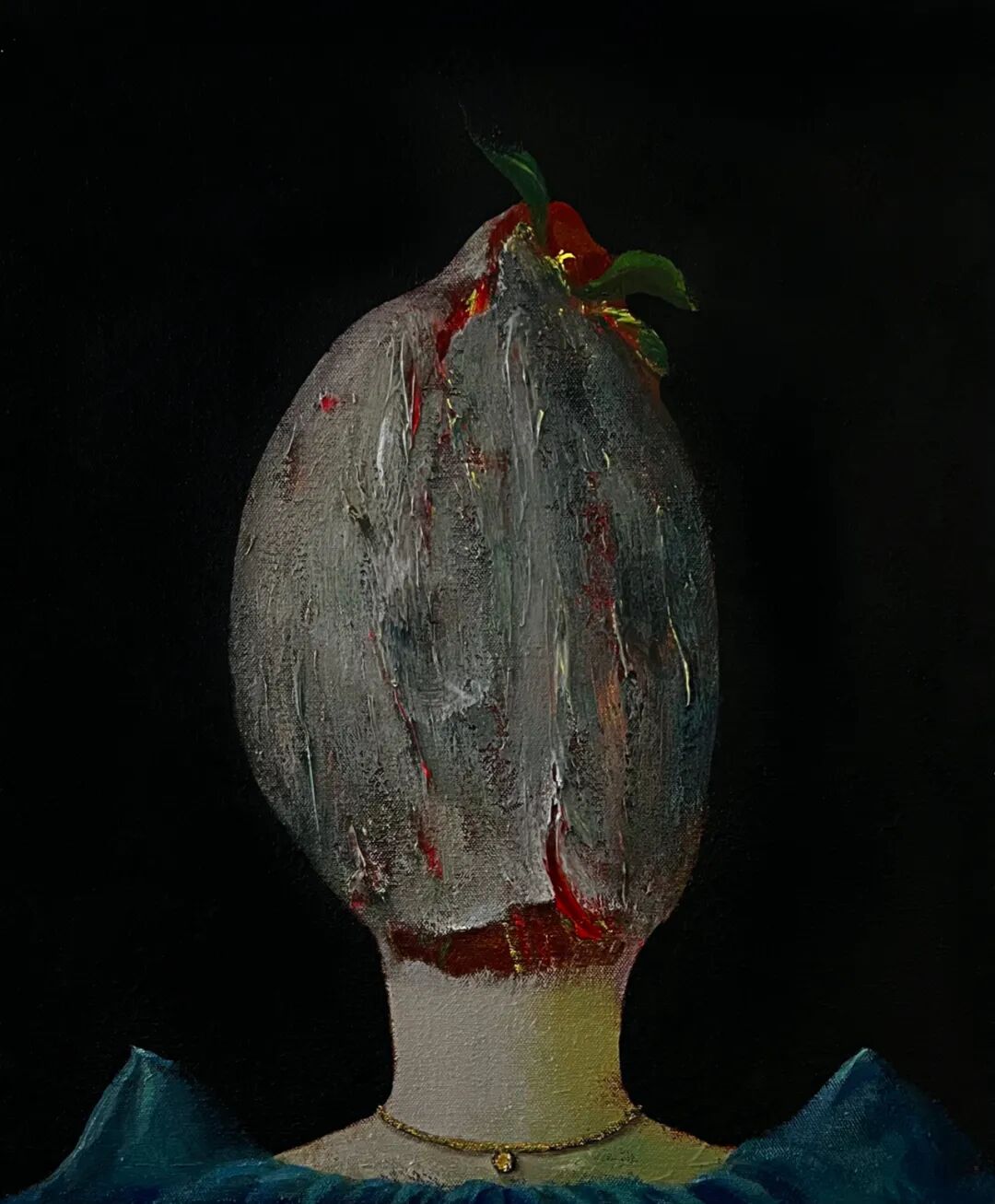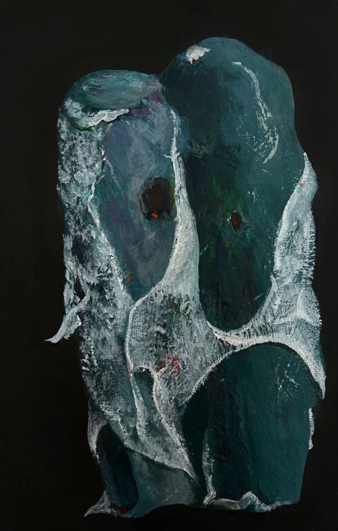这是在生物科技时代可能才有的幽灵化感知力吧?这是在幽闭年代才有的恐惧症吧?这是在生命会到内在肠道蠕动与挤压才可能发出的嘶哑叫喊?但这种叫喊还被消音了,而进入夜梦中的变形,气泡与骨头,残骸与木偶,物质被彻底幽灵化了,幽灵也留在了物质的痛楚里,我不禁要把郑文泉当作残酷戏剧与绘画的发明者阿尔托的同路人与继承者了,这是在培根之后,接续奥尔巴哈的材质堆积而不是弗洛伊德的完整性之后,再次回到绘画平面性而打开感知深度的探索。这个物质的幽灵深度,来自于绘画之为表面表皮的剥离,似乎物件与人性都仅仅剩下一层技术合成的生物表皮,可以背剥皮,可以被刮伤,可以被移植,但都传达出这个物象的生命戏剧,因此画面内部有时会出现一道幕帘一样的背景,让这个物出场。