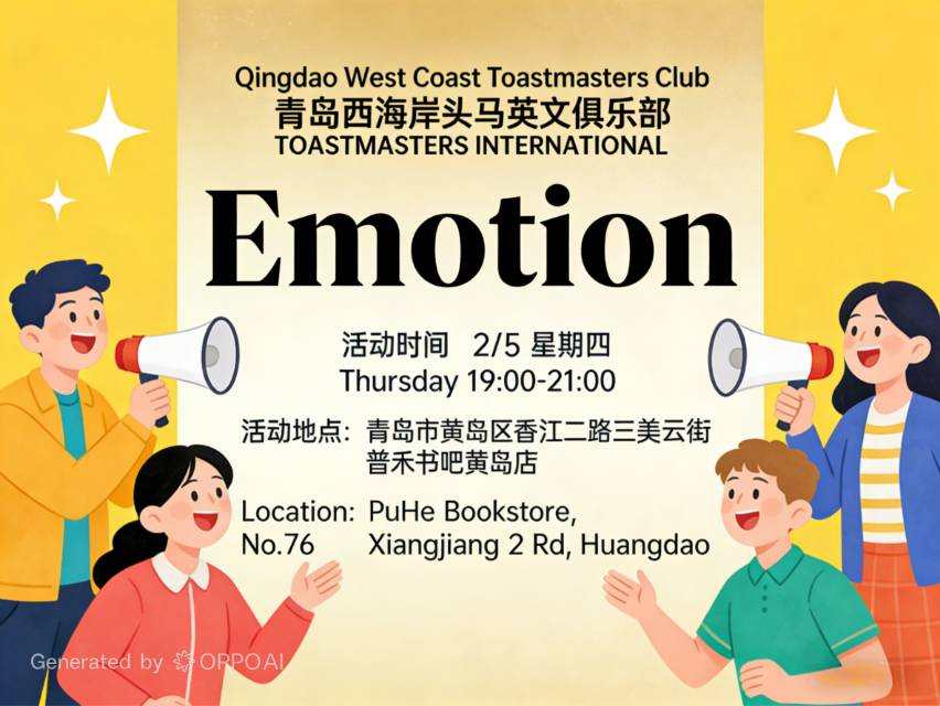 At this Toastmasters event themed "Emotion", we’ll unlock the treasure chest of feelings in English. Share your joy, voice your worries, and explore the vivid spectrum of emotions through interactive talks. Let every sentiment become a bridge that connects us, turning our inner world into stories that resonate and inspire.