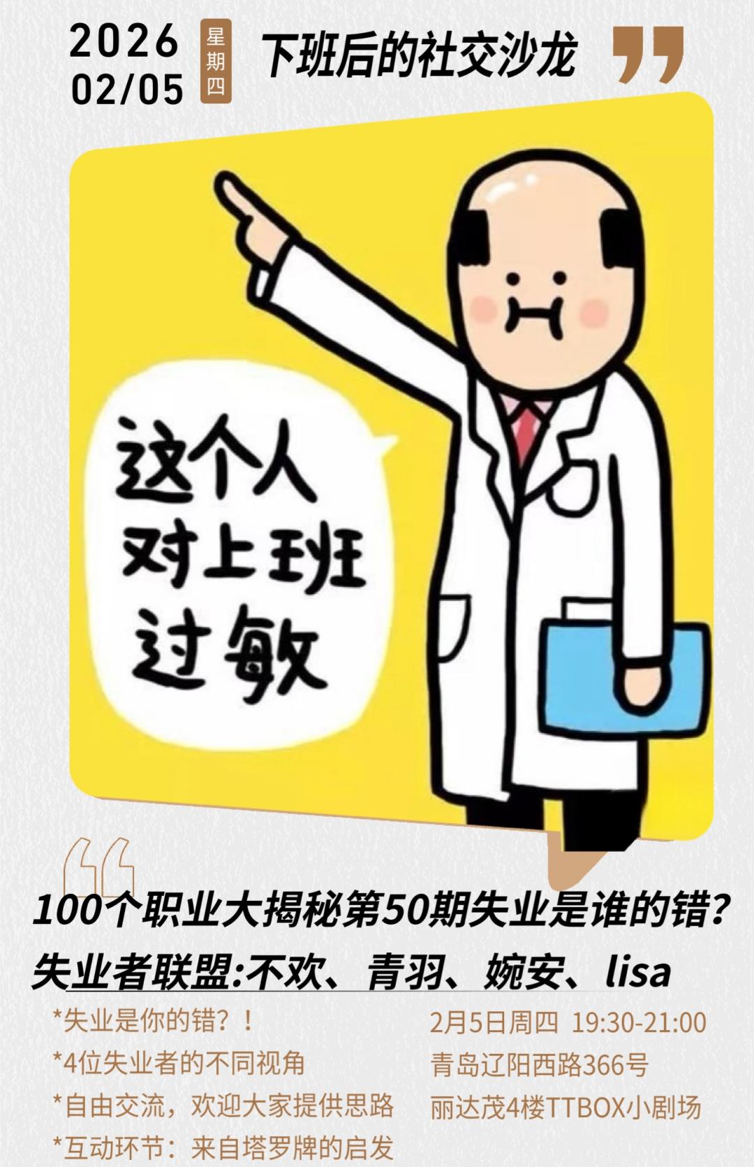 自由交流环节我们希望听众参与讨论,现身说法,给失业者联盟一些支持,特别期待感觉会很有意思的一期访谈。