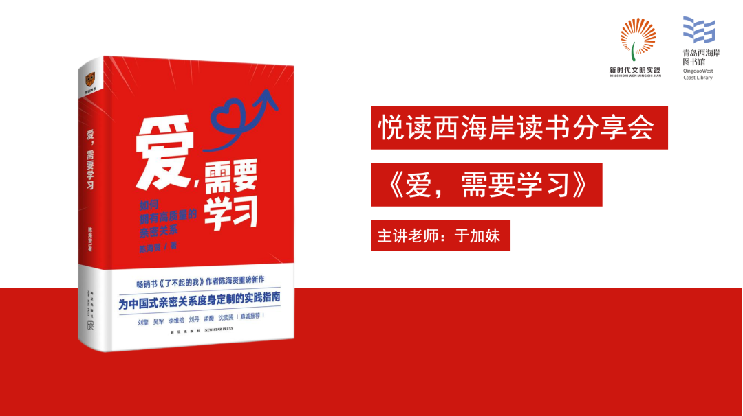 2月4日,青岛西海岸图书馆“悦读西海岸”读书分享会特邀于加妹老师继续围绕《爱,需要学习》一书展开深度交流。本期将带领大家持续深入探索关于爱的认知之旅。
