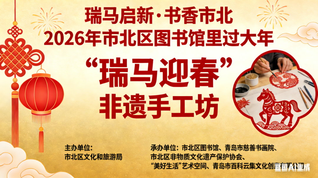 瑞马启新岁,年画贺新春!作为“瑞马启新・书香市北”2026 年市北区图书馆里过大年系列活动的重磅环节,“瑞马迎春”非遗手工坊木版年画体验课即将开讲!特邀非遗代表性传承人亲临授课,解锁马年主题木版年画拓印技艺,让大小读者在墨香与匠心交融中感受非遗魅力,拓印浓浓年味。现面向全城招募35组亲子家庭,免费参与,先到先得!