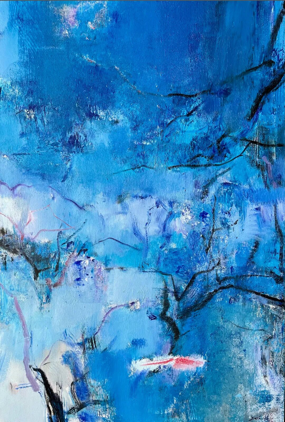 而艺术家在自我表述中提及的:画的是梦里的蓝,是“捉不住的思念”,是“绕来绕去总在雾里打转”的寻觅。而贾雷特在科隆那一夜,面对一台有缺陷的钢琴,其实也进入了一片“声音的雾里”——他放弃了熟悉的低音区域,就像我放弃了现实的颜色,把山和水都染成蓝。他在中音区和高音区里“绕来绕去”,结果绕出了一条全新的音乐语言。都在“受限制”中找到了更深的自由。