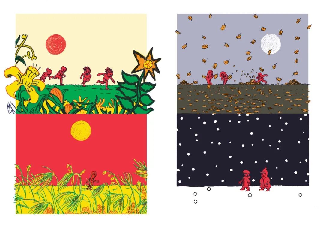 色彩运用是凯斯勒视觉语言的另一支柱。他坚持使用红、黄、绿、蓝四种颜色创作,这种看似受限的色彩方案实则潜力无穷,无论现实还是情感,可描绘的范围非常之广。凯斯勒根据情节节奏灵活调整色彩强度:“当情节不那么动荡起伏时,色彩和图画就会变得柔和、沉稳。画得更细,动作和姿势也更少,视角也更简单、固定”,形成了视觉节奏与情感起伏的完美协同。