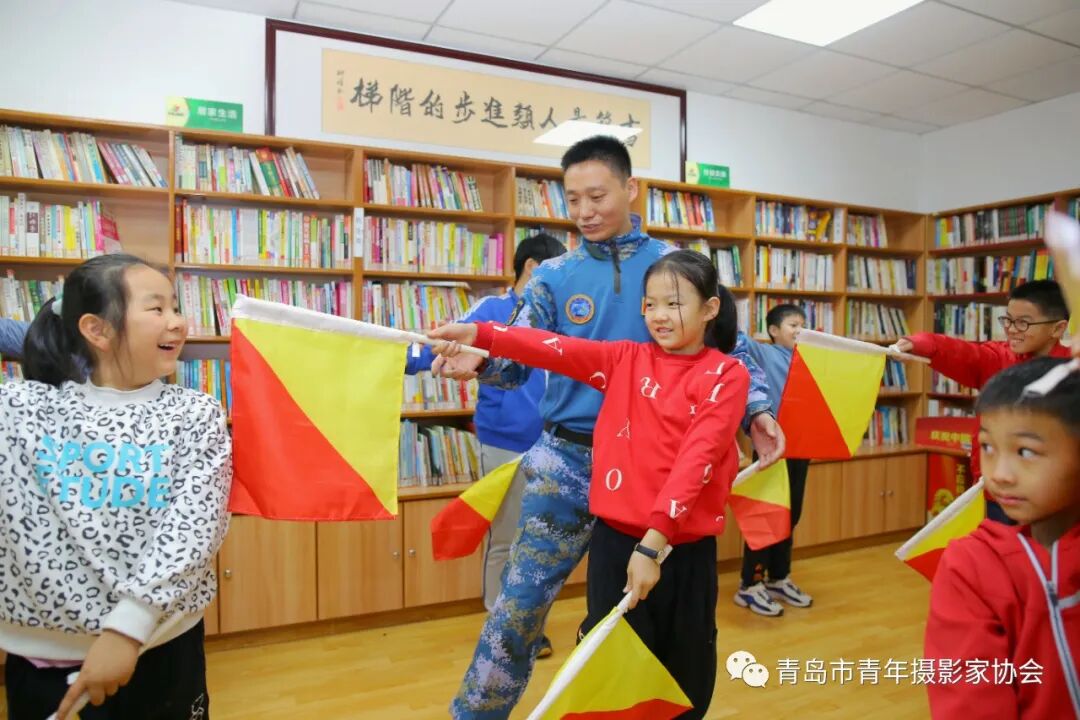 2022年1月18日,青岛市李沧区旭东社区逐梦深蓝•向海图强爱国主义公益课堂,退役军人苏新旺教孩子打海军旗语