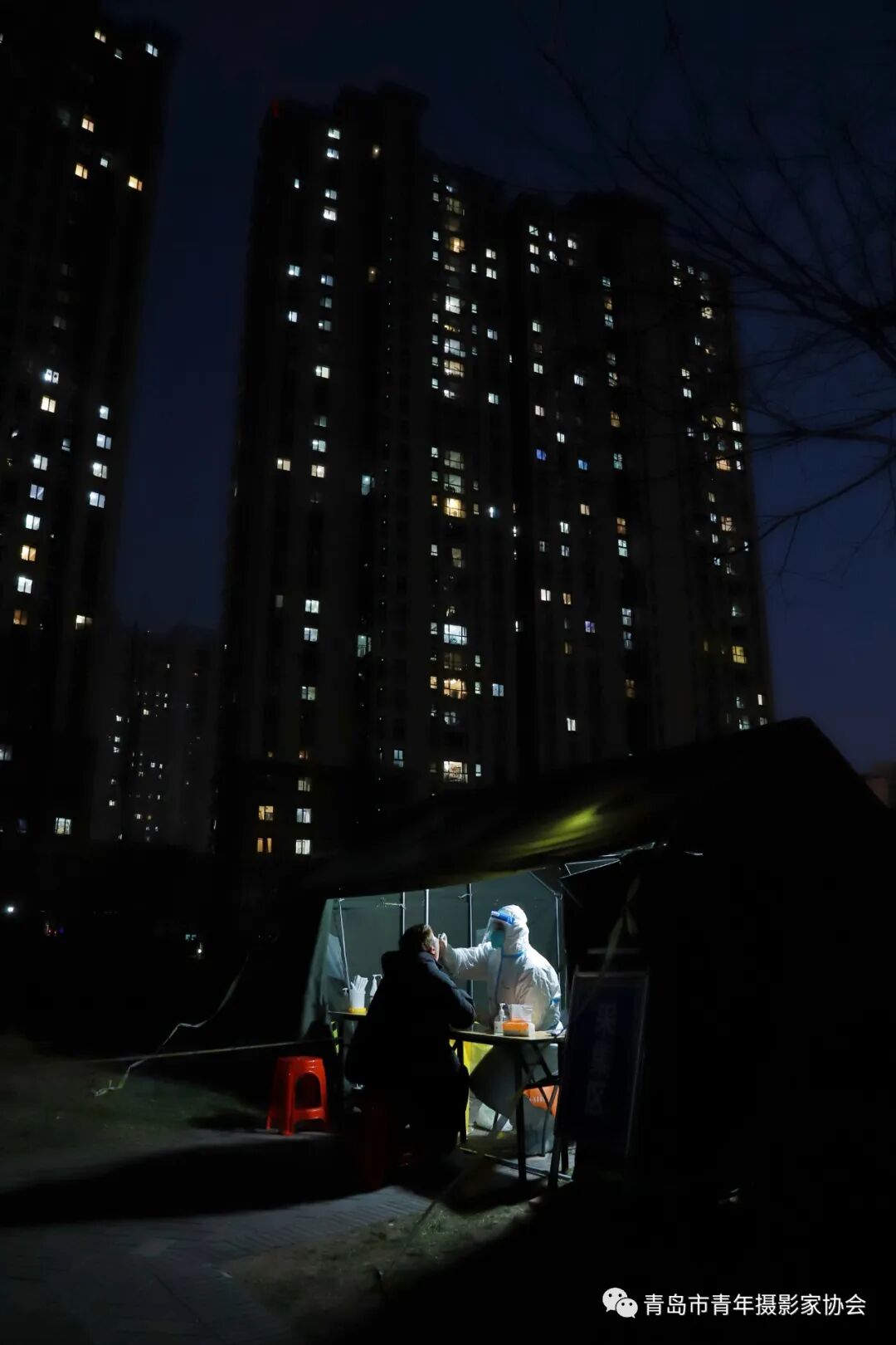 2022年3月23日,青岛市李沧区浮山路街道旭东社区一核酸采样点,第五轮核酸已接近尾声,有的居民陆续到楼下进行核酸采样,青年“大白”守护着旁边高层中的万家灯火