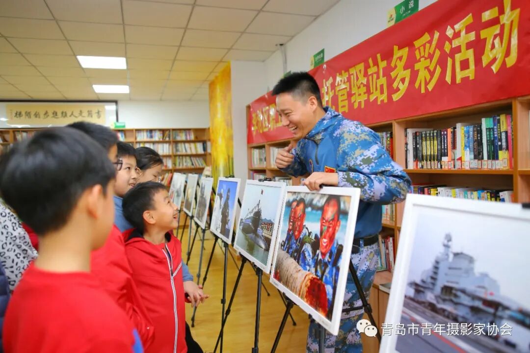 2022年1月18日,青岛市李沧区旭东社区逐梦深蓝•向海图强爱国主义公益课堂,退役军人苏新旺向孩子讲解大国海疆摄影展