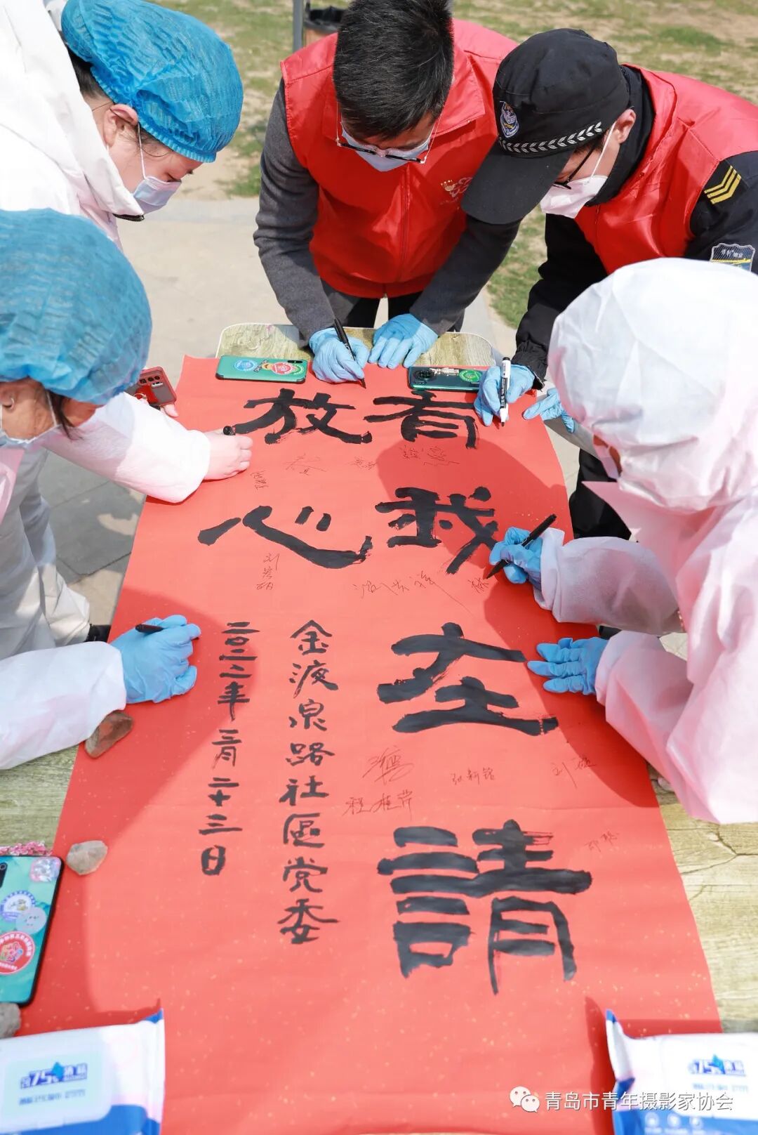 2022年3月23日,在青岛市李沧市浮山路街道金液泉路社区,检测点医护人员、社区干部、青年团员、志愿者们在“有我在 请放心“书法作品上签上自己的名字,表达了他们抗疫决心