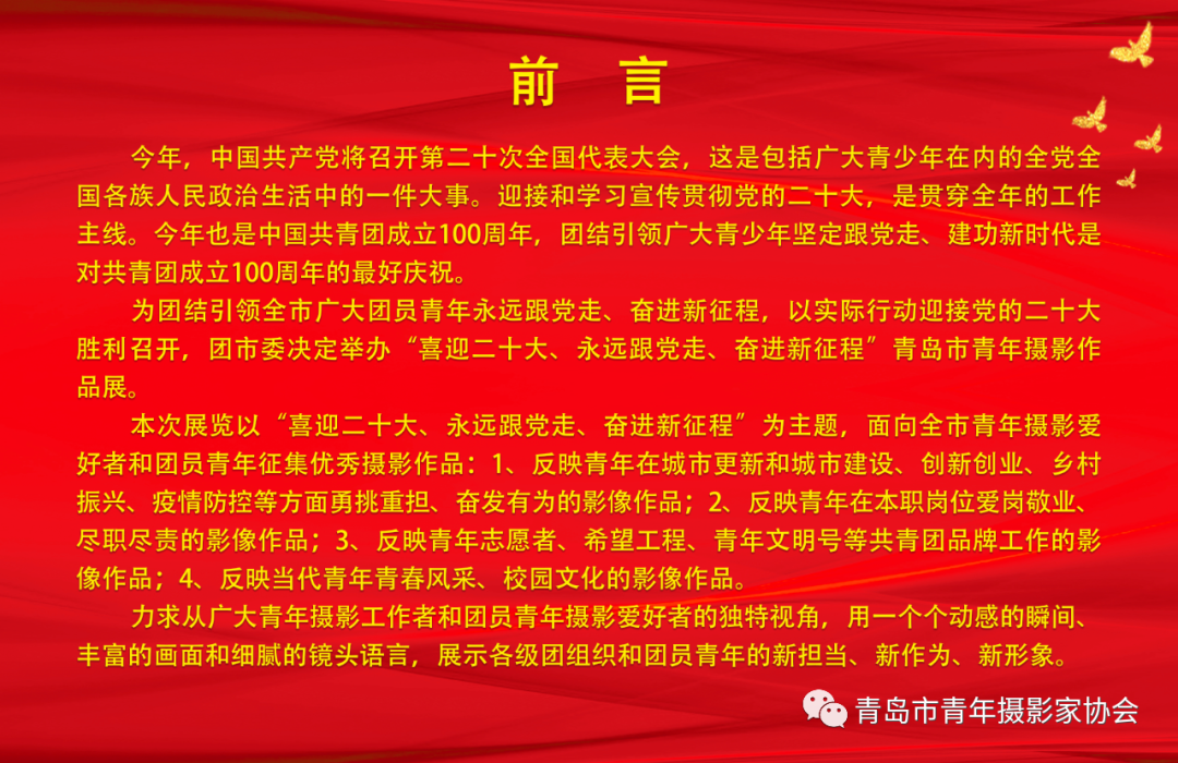 为团结引领全市广大团员青年永远跟党走、奋进新征程,以实际行动迎接党的二十大胜利召开,团市委决定举办《“喜迎二十大、永远跟党走、奋进新征程”青岛市青年摄影作品展》。