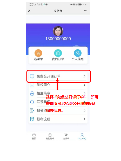 第七步:报名成功后,返回主页面点击右下角“个人中心”,选择“免费公开课订单”,即可查询所报名免费公开课课程及相关信息。