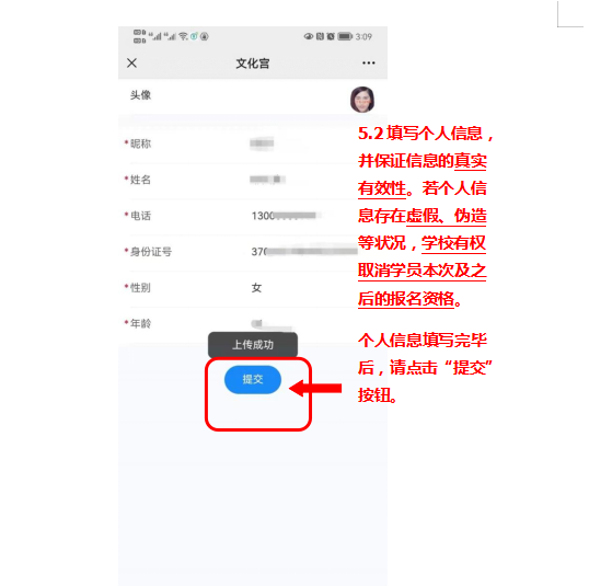 第五步:填写个人信息,并上传本人1寸电子照片。请务必保证信息的真实有效性。若个人信息存在虚假、伪造等状况,学校有权取消学员本次及之后的报名资格。