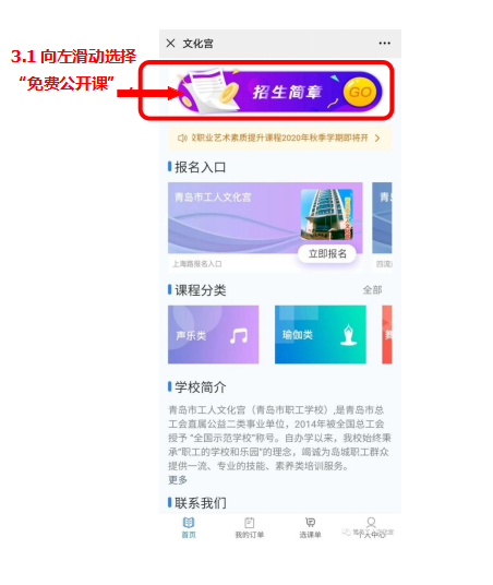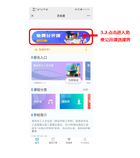 第三步:进入报名界面,点击“免费公开课”进入选课界面。