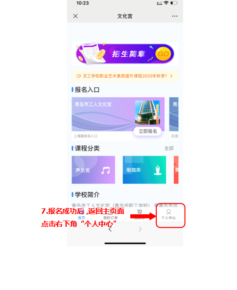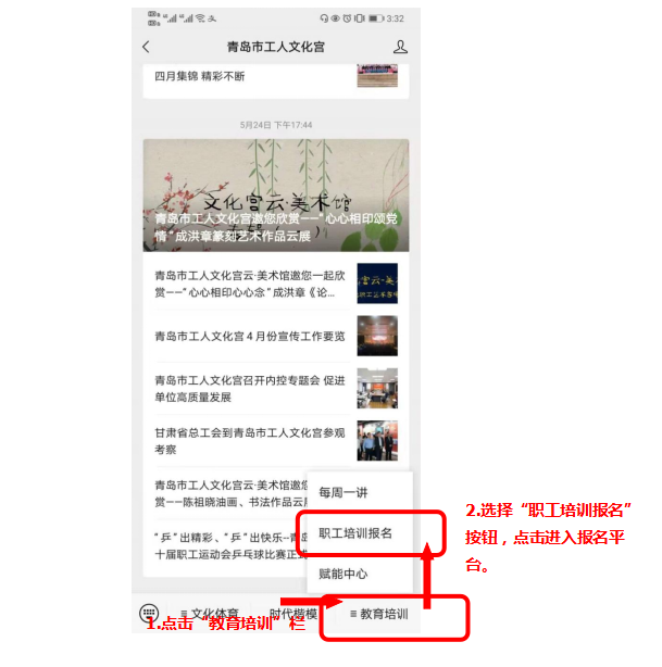 第一步:扫码二维码,进入青岛市工人文化宫(青岛市职工学校)公众号,未关注公众号的学员需先关注公众号。