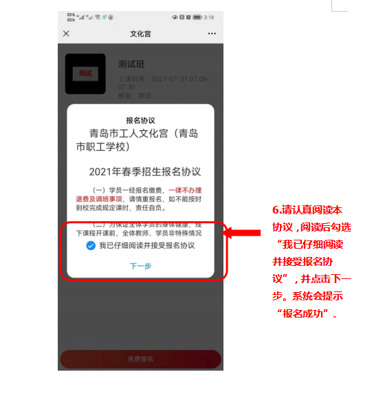 第六步:选择课程的学员在点击“免费报名”按钮后,请仔细阅读报名协议内容条款。完成阅读后点击 “我已仔细阅读并接受阅读协议”按钮,报名成功。