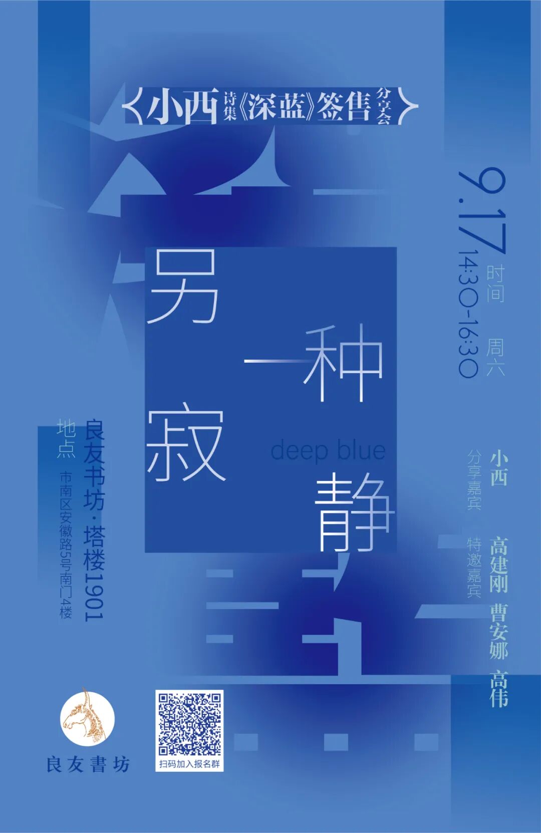 诗人小西的诗集《深蓝》,由中国海洋大学出版社2022年6月出版,精装本。收录了诗人近四年来创作的诗歌一百余首,分为“多年以后,朋友们”“另一种寂静”“雨中听琴”三辑。