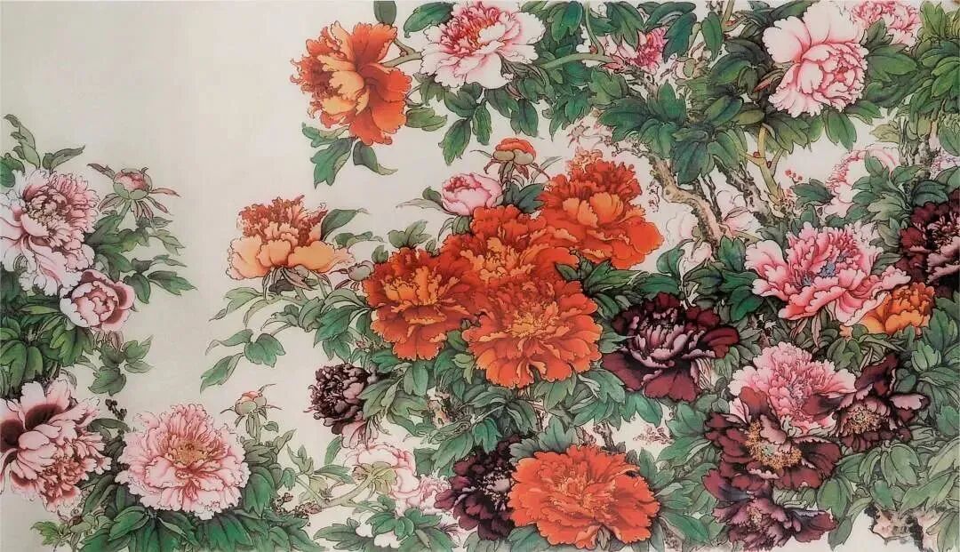 1959年,为人民大会堂山东厅创作巨幅绢本工笔重彩画《满堂红》,现藏于北京人民大会堂。