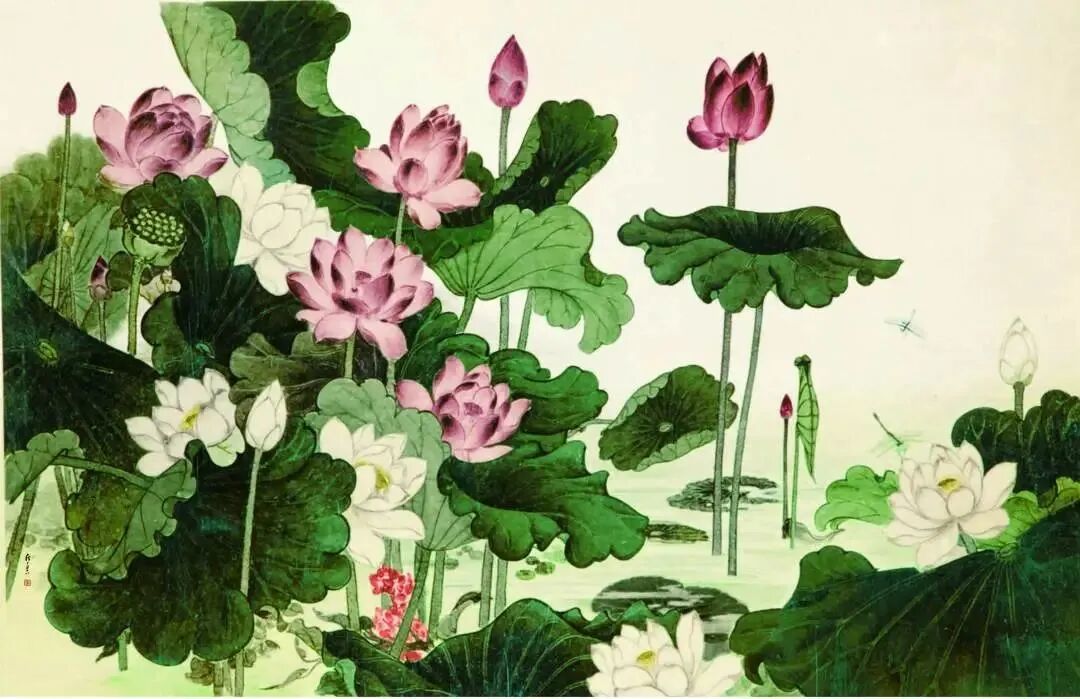 1959年,为人民大会堂山东厅创作巨幅绢本工笔重彩画《十里荷香》,现藏于北京人民大会堂。