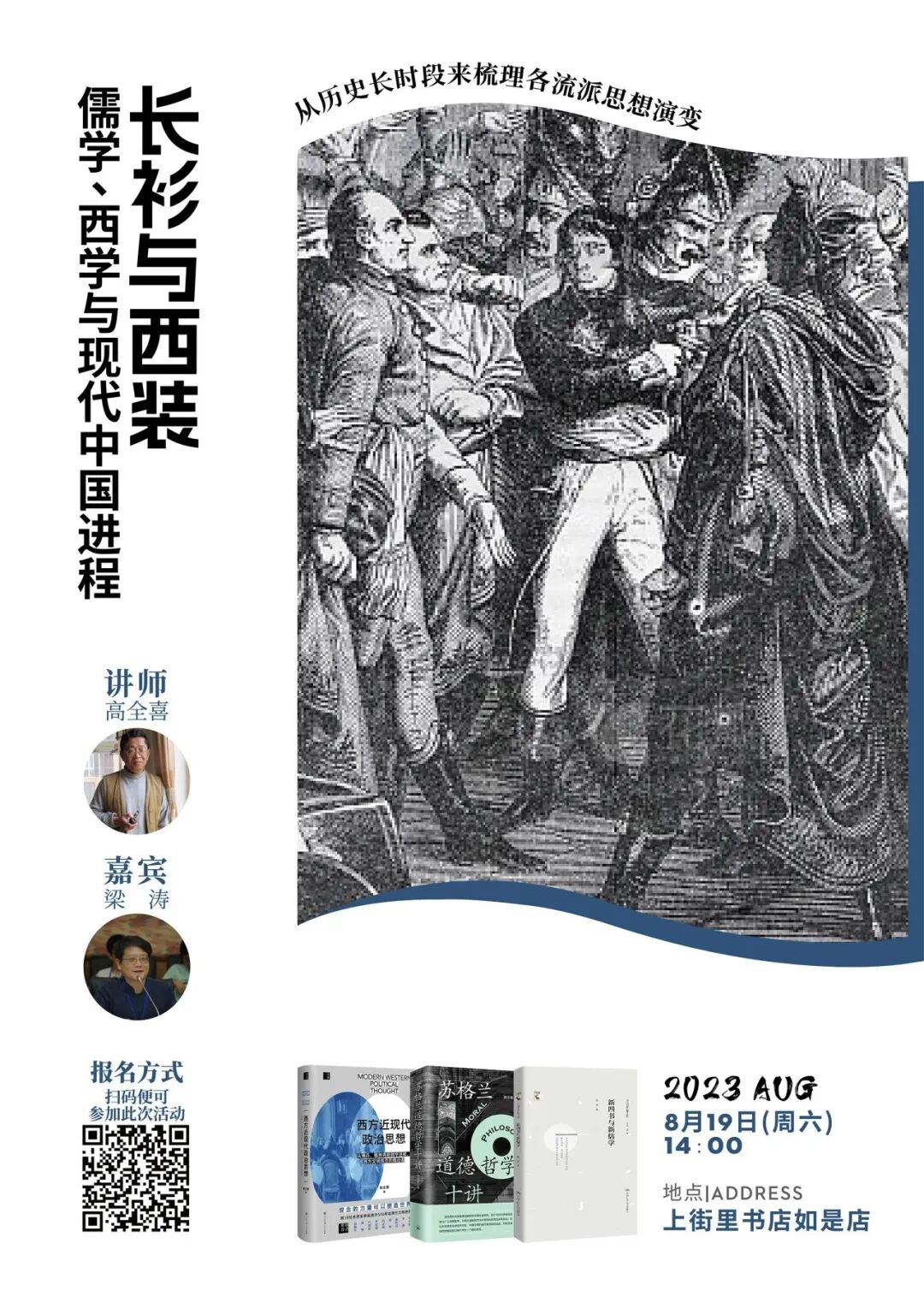 8月19日周六下午14:00,一起来上街里书店·如是店倾听高全喜老师和梁涛老师的对谈“长衫与西装——儒学 、西学与现代中国进程”。