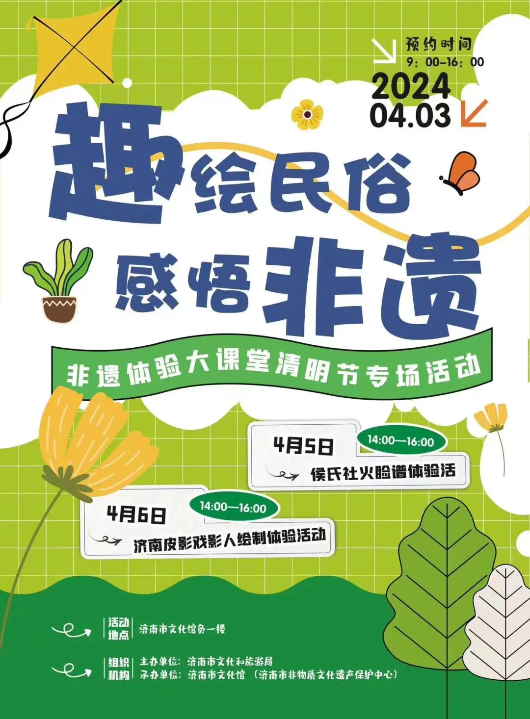 春风起,纸鸢飞,万物复苏愈明媚。清明节,又称踏青节,是中华民族传统的祭祀节日之一。为贯彻落实党的二十大精神,弘扬中华优秀传统文化,进一步增强青少年的民族文化认同感和自豪感。在清明假期间,济南市文化馆将开展非遗体验活动,欢迎小小传承人踊跃报名参加,名额有限,拼手速!