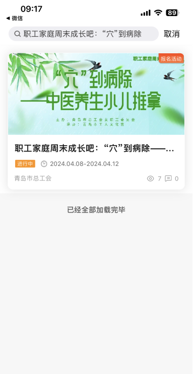 第三步:搜索“职工家庭周末成长吧:‘穴’到病除——中医养生小儿推拿”,打开活动链接,报名即可。