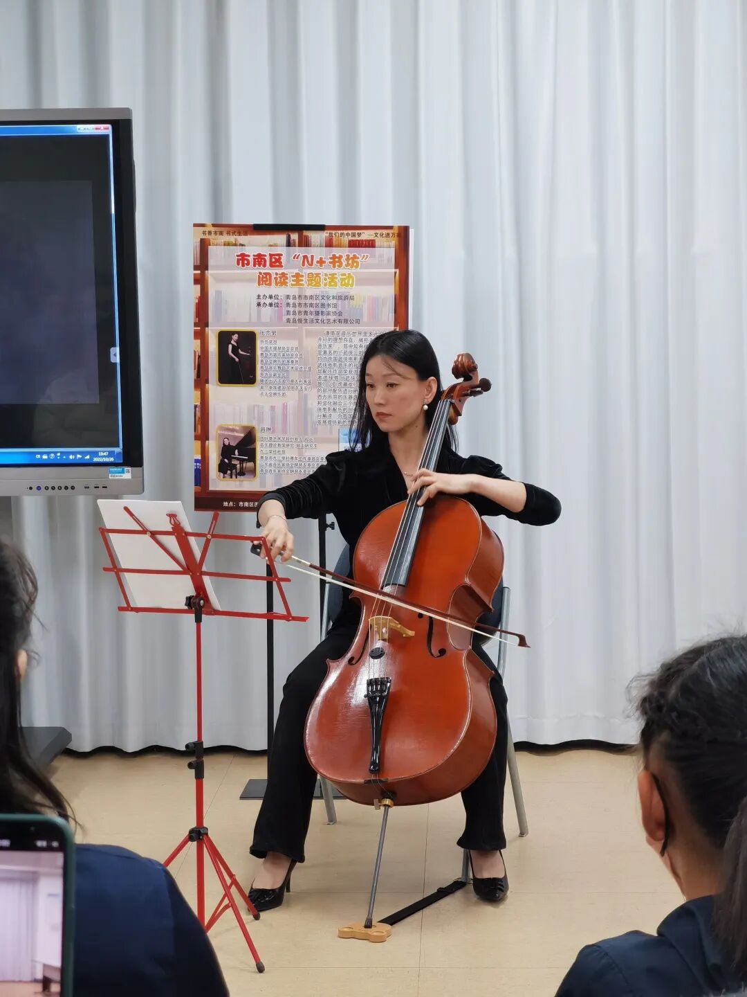活动由市南区文化和旅游局主办,市南区图书馆联合青岛慢生活文化艺术有限公司、青岛市青年摄影家协会等单位共同承办。本次主题阅读会邀请到中国大提琴协会会员、青岛市音乐家协会会员张亦男老师和山东省音乐家协会会员、四叶草艺术学校创始人昌琳老师,两位音乐家老师通过解读电影经典片段,现场演绎经典配乐,带领读者们一起畅游谭盾先生“武侠三部曲”的音乐世界。