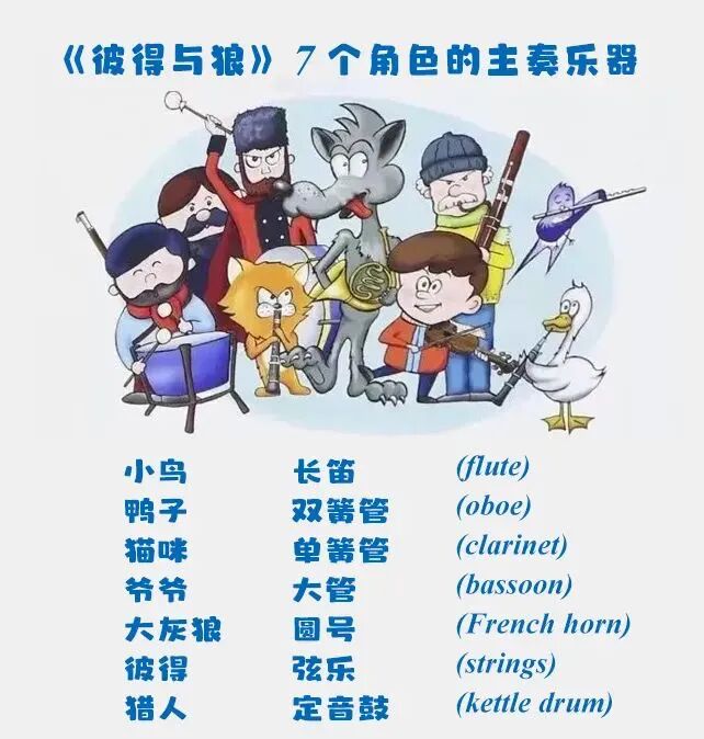 此作品以七个角色主题为素材,用固定的乐器展示角色形象。长笛用透明灵巧的跳跃性旋律表现啼鸣飞舞的小鸟;双簧管用中音区的悲歌性曲调表现温驯善良的鸭子;单簧管用低音区的跳进音调表现机灵调皮的小猫;大管用深厚徐缓的宣叙调模仿善良唠叨的老爷爷;三支圆号吹奏冷酷阴险的和弦和突出重音的音调来描绘凶残贪婪的大灰狼;定音鼓急速的滚奏和大鼓的敲击声模仿旷野中猎人的阵阵枪击声;弦乐合奏以充满朝气和活力的进行曲来刻画机智勇敢的彼得形象。
