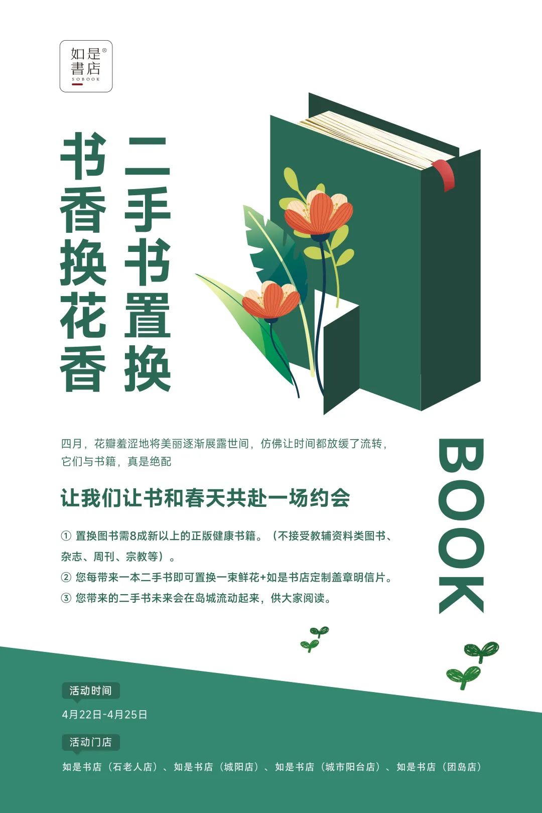 ①活动当日每本二手书可换取一支鲜花+如是书店定制明信片一份;