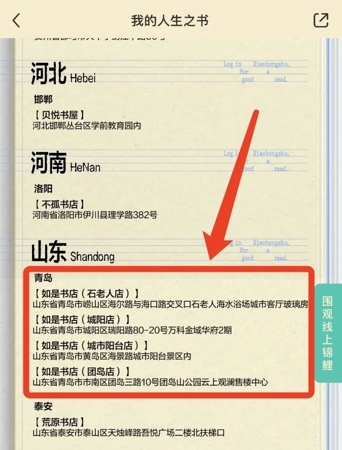 即日起,打开小红书APP搜索“小红书423”可抽取锦鲤大奖;在主会场进入“线下活动”板块,按照如是书店各门店地址到店打卡,解锁小任务即可参与线下抽奖!