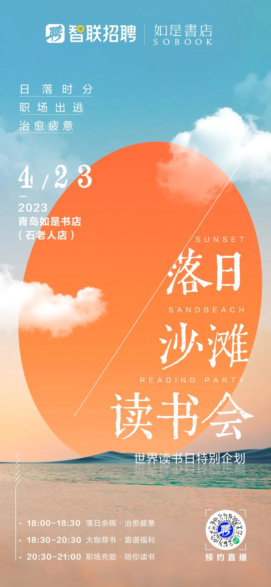世界读书日直播特别企划,来一场浪漫出逃吧!智联招聘携手五大知名出版社和如是书店,打造落日沙滩读书会,落日余晖/治愈疲惫/大咖荐书/职场充能,主打一个浪漫惬意~